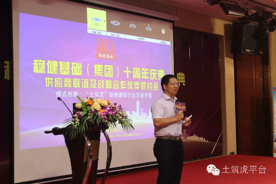深圳稳健基础(集团)总经理陈阳亮先生与现场嘉宾共同回顾了深圳稳健基础(集团)的成长历程。深圳稳健基础(集团)起步于2006年开始营业的深圳市稳健基础工程有限公司。十年来,公司经营业绩增长迅速,不断创造历史新高,营业额年均增长率60%。公司经营范围不断扩大,从基础施工扩大到专业基础施工、新型建材研发与生产、工业地产、重型物流运输、股权投资、网络科技服务等六大领域。今天,公司实力雄厚,净资产超过8亿人民币。陈阳亮总经理向现场嘉宾分享了公司的战略发展成果,指出深圳市稳建基础工程有限公司十年成长史,也是一部跨区域、跨行业多元发展的战略扩张史。公司先后投资设立了:宁都鹏城生态科技有限公司、江西中泰来混凝土管桩有限公司、九江中泰来新型建材有限公司、深圳市稳健基础工程有限公司九江分公司、深圳市稳健基础工程有限公司江西分公司、唐人车区科技有限责任公司、九江稳捷物流有限公司、深圳市前海稳健投资控股有限公司、深圳土筑虎网络科技有限公司。陈阳亮总经理在现场豪迈的分享了稳健基础(集团)新的十年发展战略,誓将"土筑虎网"打造成解决行业痛点的高效工具,打造成全球最具投资价值的平台,十年内将平台打造成千亿市值的上市公司,以回报社会,回报股东,回报会员朋友。土筑虎网络平台已于2016年5月正式向全球发布。