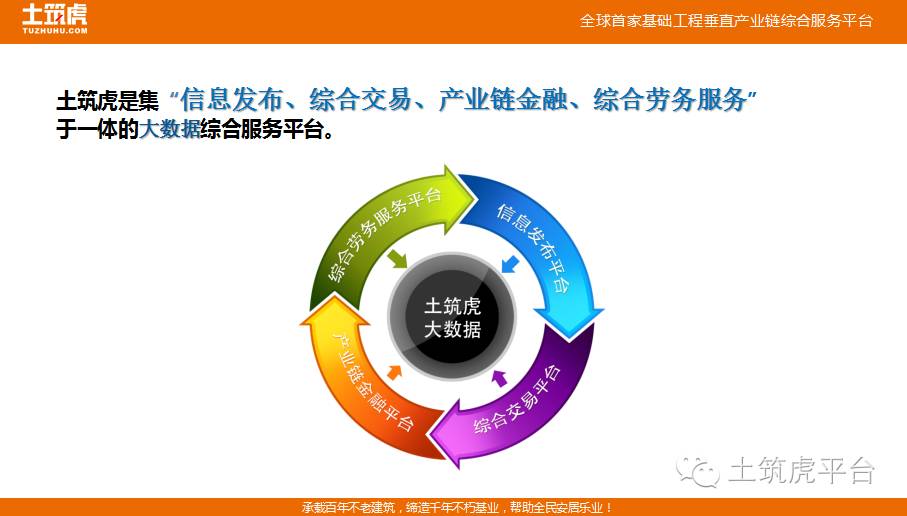 作为深圳土筑虎网络科技有限公司发起人和创始人,董事长陈阳明先生向大家分享了创建"土筑虎"的初衷和目标。陈董事长分享了从事建筑行业20余年的经历,深刻体会到了行业人士的痛苦,最突出的是:信息不对称、不透明不精准、招投标程序繁琐、交易成本高、资金回笼慢、使用成本高、行业数理统计难、行业资源共享难、行业信用缺失、监管难度大等一系列问题,一直困扰着所有建筑行业从业人士,他一直在思考有什么好的办法可以解决这些问题,达到净化行业风气、规范行业行为、节约社会成本的目的。经过一年多的思索、斟酌、推敲、试措,他终于找到了一个高效互联的工具,那就是互联网+基础工程垂直产业链——土筑虎网。陈董事长现场向大家详细介绍了土筑虎网的商业模式和业务模式以及操作流程。陈董事长指出土筑虎平台将传统繁杂的建筑行业变得简单、方便、快捷、精准、低成本,并立志将毕生精力和心血铸就土筑虎网络平台,为会员打通上下游信息渠道,为他们广开业务来源、为企业降低经营成本、为行业建立诚信体系。请登录www.tuzhuhu.com